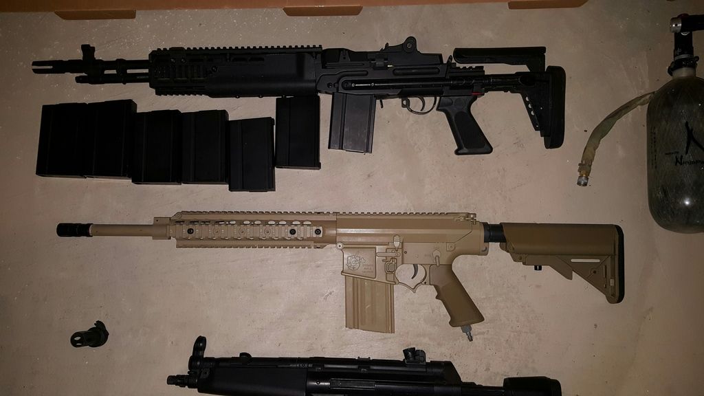 Inferno Spartan Ares M110 - 1 midcap, carbine model, hard to find. 400 OBO. I paid over 200 for the externals, so pick it up, it's a good deal.